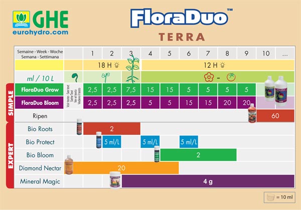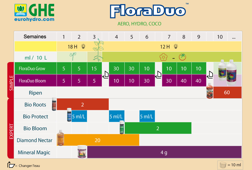 FloraDuo — это полноценное питательное вещество, специально разработанное для быстро растущих растений с явным различием в потребностях при росте и цветении. Оно поступает в 2 частях: FloraDuo «Рост» и FloraDuo «Цвет». Для гарантирования наилучших результатов и адаптации ко всем регионам GHE предлагает «Рост» в 2 версиях: одна для жесткой воды, а другая для мягкой. FloraDuo «Рост — мягкая вода» предназначается для обессоленной воды и воды с обратным осмосом.