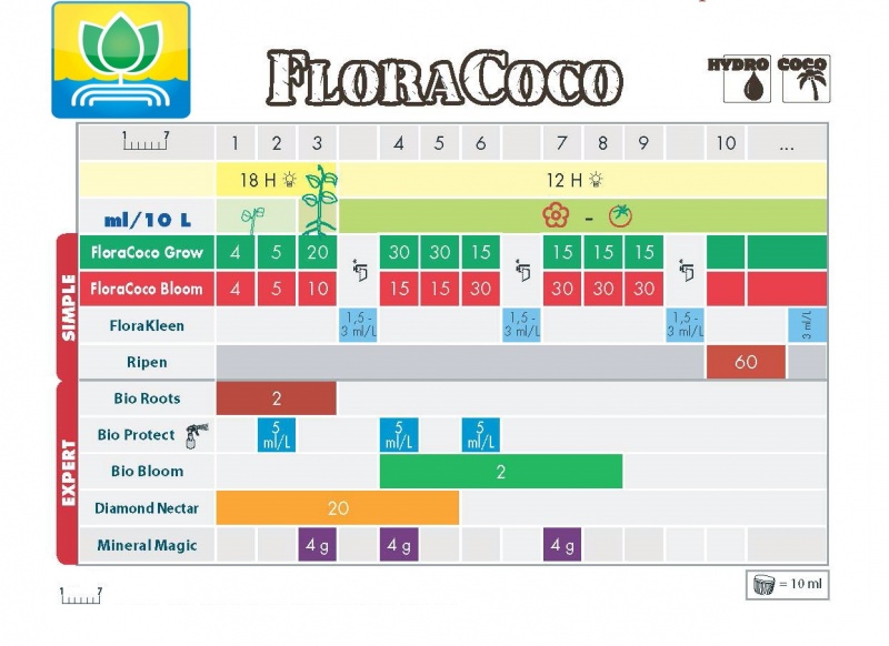 FloraCoco™ (Grow и Bloom) - сильнодействующее, полноценное, уникальное удобрение с содержанием кальция и магния, достаточным для обеспечения отличного роста растений, не требующее использования добавок (кальция, магния и фосфора) в отличие от большинства удобрений для кокосовых субстратов, предложенных на рынке на сегодняшний день.